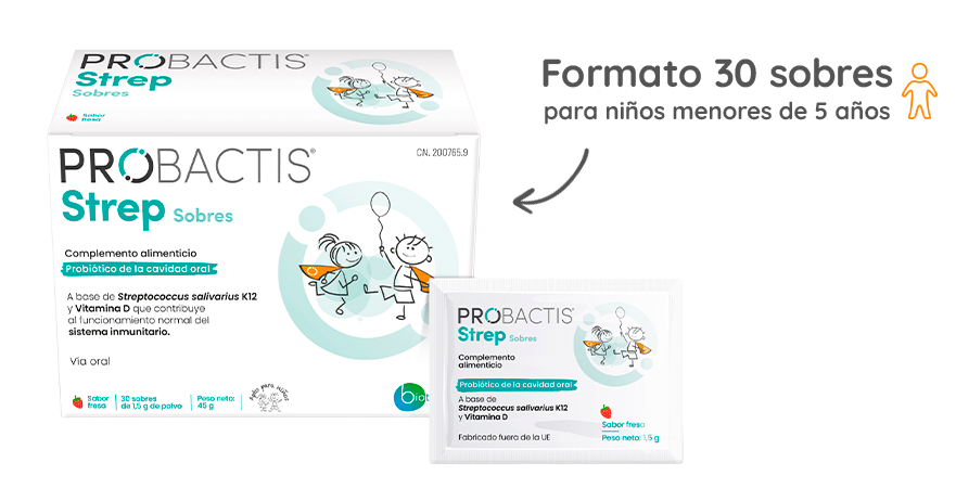 Probactis Strep® es un probiótico que contiene la cepa Streptococcus salivarius K12, que favorece una microbiota adecuada del oído y la garganta en niños y adultos.