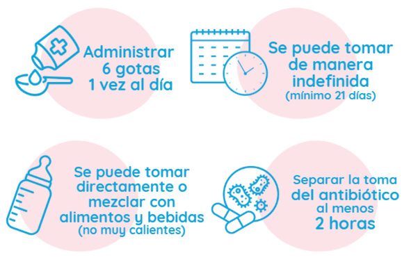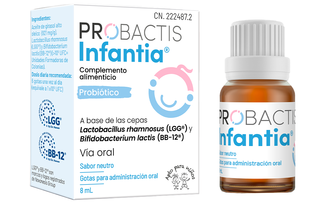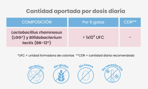 Probiótico a base de Lactobacillus rhamnosus (LGG®) y Bifidobacterium lactis (BB-12®) que favorece el bienestar intestinal y la inmunidad desde el primer día de vida.