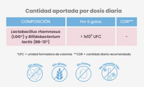 Se presenta en 1 botella de 8mL con Lactobacillus rhamnosus (LGG®) y Bifidobacterium lactis (BB-12®), recomendado para bebés y mamás embarazadas y lactantes.